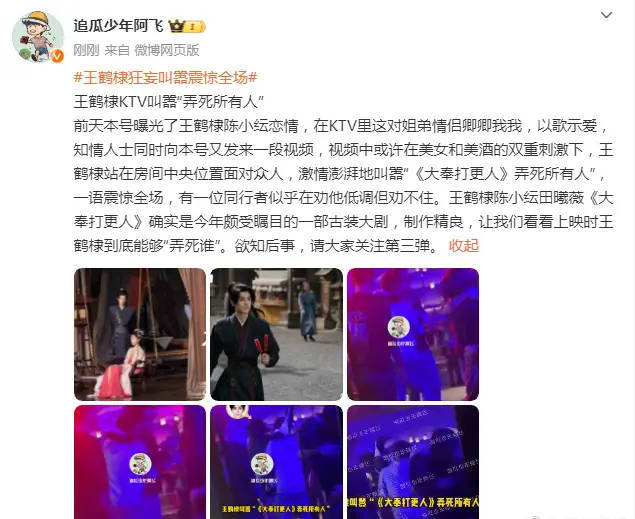 9月14日,八卦媒体爆料称王鹤棣在KTV面对众人,激情澎湃地喊着:“《大奉打更人》弄死所有人”,有一位同行者似乎在劝他低调但劝不住。