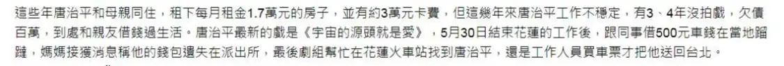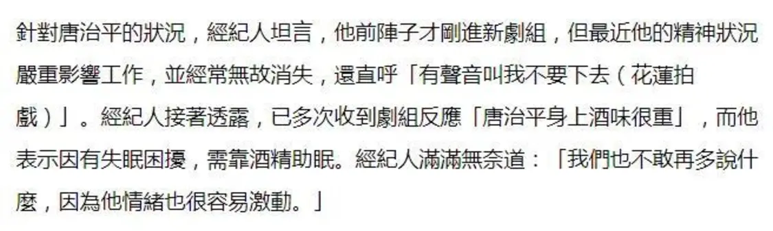 他的经纪人也透露,唐治平每次来到拍戏现场,都能在身上闻到浓浓的酒味。经纪人与唐治平谈到此事,他则称因为严重失眠,所以要靠喝酒助眠。
