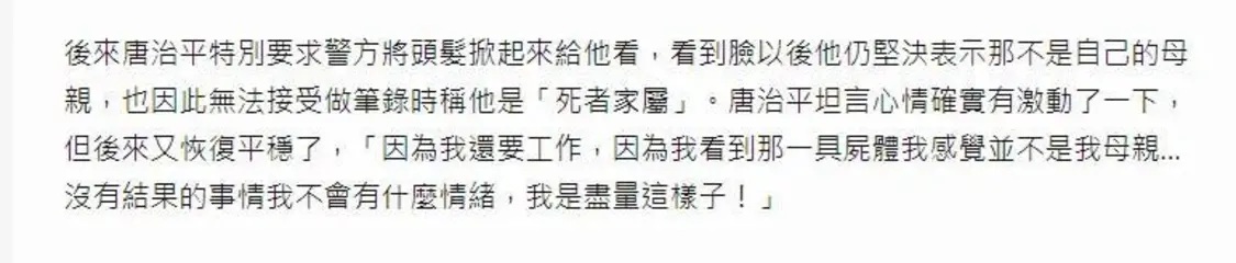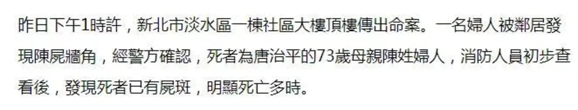 经确认,死者是男演员唐志平的73岁老母亲。警方联系到他时,唐志平喝的烂醉神志不清,对于母亲死讯没有任何反应,说死者的衣服妈妈从没穿过,更是不知道母亲已经失踪两天以上。