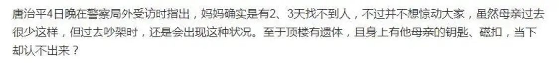 据他本人所说,妈妈经常有2、3天找不到人,他已经习惯了,所以不想麻烦警方。但据邻居所说,他们在前几天还听到母子两人因唐志平工作而争吵。