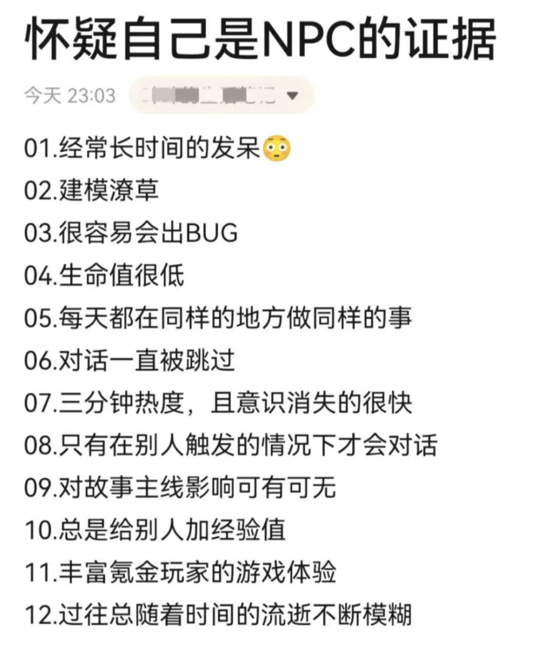 因此网络上诞生出一套“NPC文学”,网友纷纷po出怀疑自己是NPC的证据,“我就说这几天怎么这么难熬,原来主角有剧情啊”。