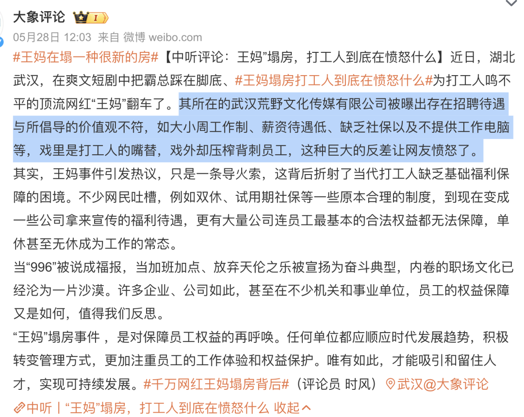 很快,王妈迎来了塌房,因为人们发现以“为打工人代言”为标签的主创团队给出的薪资涉嫌压榨打工人。