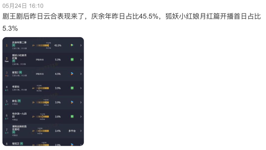 你方唱罢我登场,前有《庆余年2》五年后回归,全平台数据创历史新高;