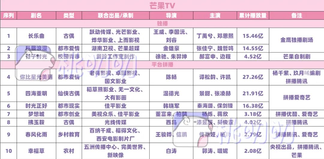 鉴于女性用户占比高达70%,芒果依旧延续湖南卫视的传统,在暑期“甜度给够”。从《你比星光美丽》《四海重明》到《私藏浪漫》《长乐曲》,一水的小甜剧。