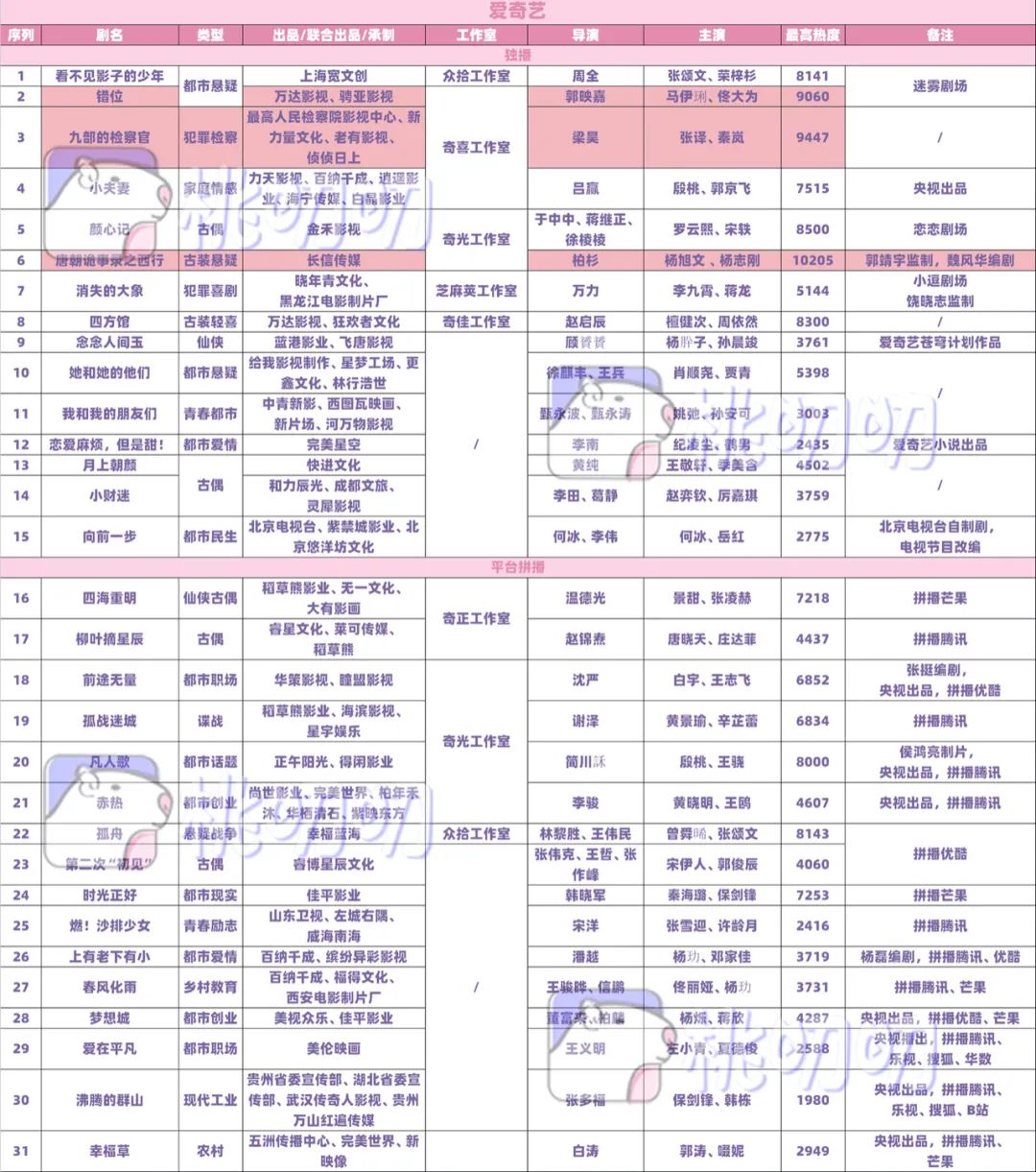 爱奇艺是四大平台中上剧最多的平台,独播 拼播足足31部,独播和拼播剧各占一半,主打一个均衡。