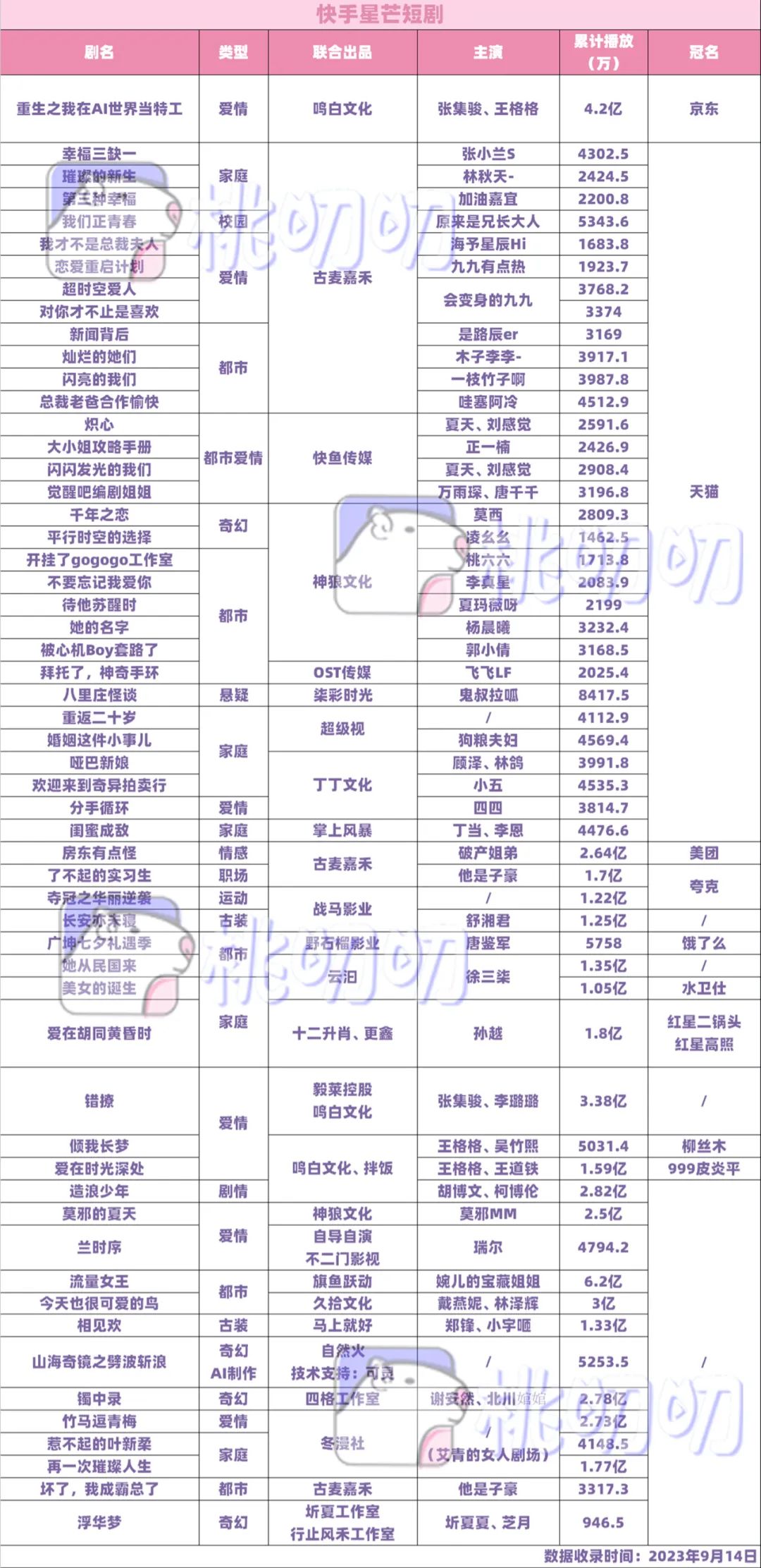 除了天猫,与京东合作,由短剧圈顶流CP张集俊和王格格合作的《重生之我在AI世界当特工》拥有4.2亿播放量,此外,星芒与夸克、999皮炎平、美团等品牌均有合作。