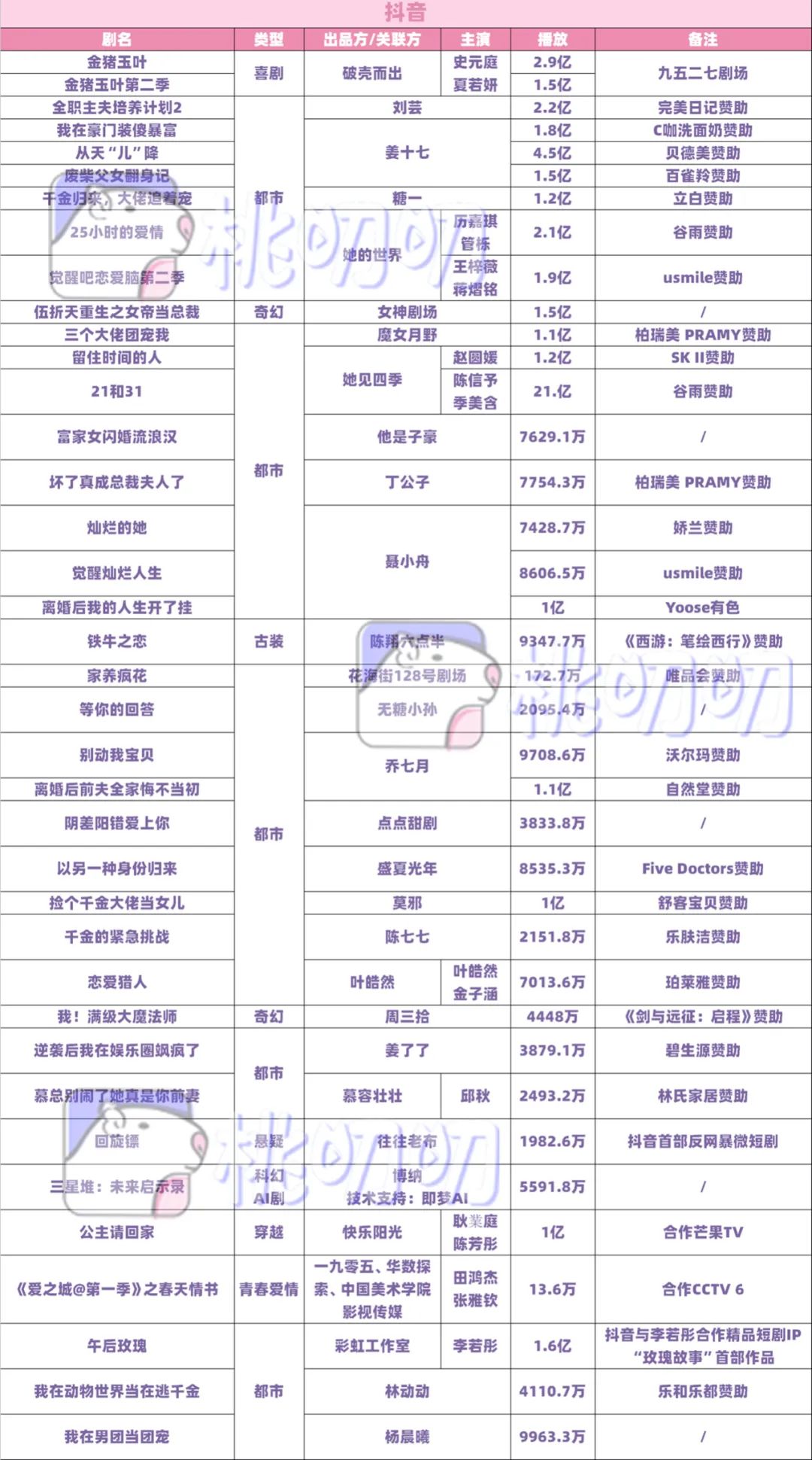 在品牌与达人的合作上,抖音则更多样且稳定,基本上大部分达人短剧都有赞助,@姜十七、@她见四季等头部账号均有上亿播放量。