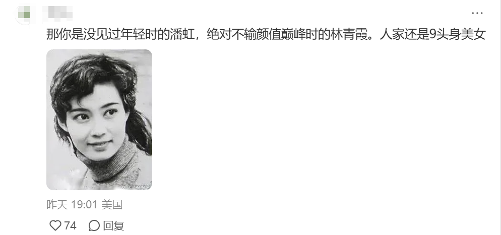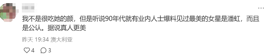 还有人说,虽然自己不是太懂潘虹年轻时的美貌,但听说90年代有业内专业人士说过,见过的最美女星就是潘虹了,这是公认的事实。