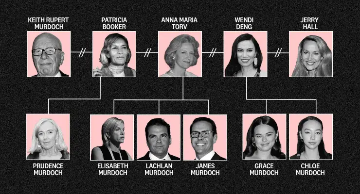 结过五次婚的默多克,一共有六个子女,分别是和三个前妻所生:和第一任妻子帕特里夏育有长女普鲁登斯,和第二任妻子安娜生下兄妹三人:拉克兰、伊丽莎白和詹姆斯,和第三任妻子邓文迪有两个女儿格蕾丝和克洛伊。
