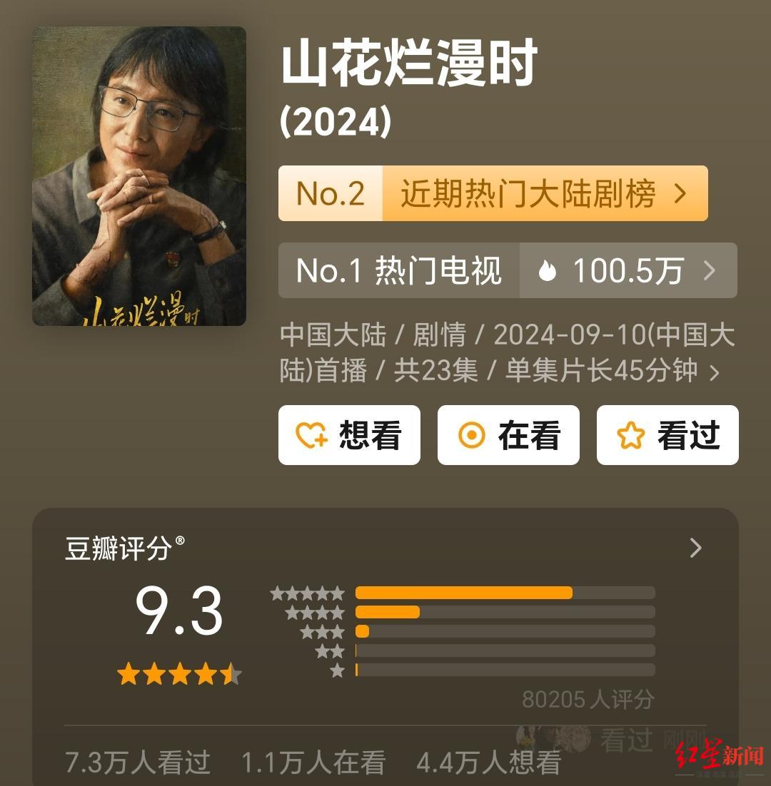 豆瓣开分达到9分,收官还在上涨,如今已经达到9.3分,电视剧《山花烂漫时》成为今年迄今为止,国剧在豆瓣拿到的最高分。
