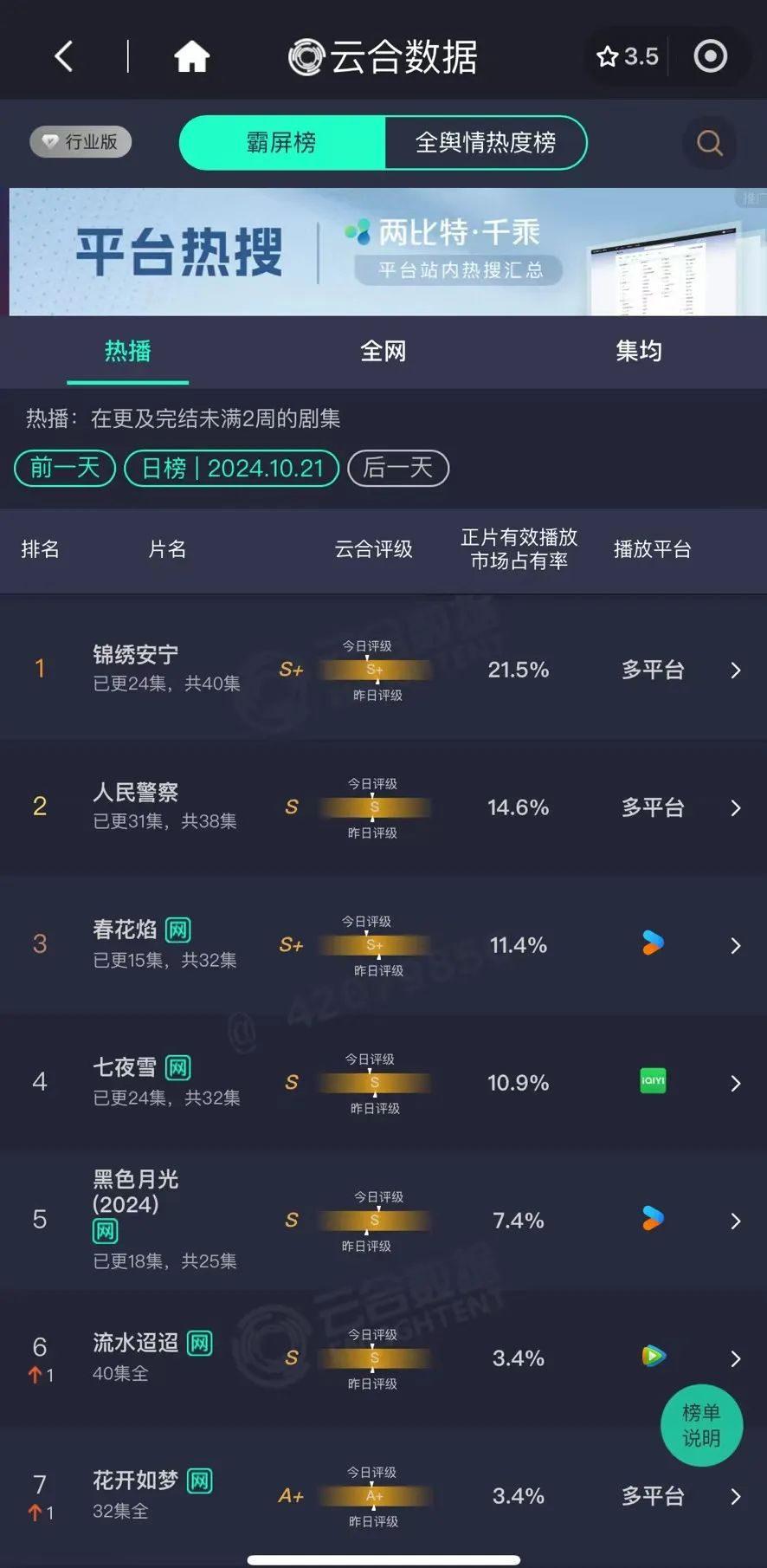尤其是新一轮的古偶上新潮,同样没有爆剧诞生。失意是多方面的:首先,平台集体押注,市场买单热情极为有限。即使是当下各大数据平台上表现最好的《锦绣安宁》,也只是在热播范畴;被寄予厚望的《春花焰》,目前来看也未能复制《墨雨云间》的爆款之路。