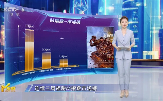 市场表现方面,电影《志愿军:雄兵出击》自上映后连续三周领跑M指数-市场榜,本周票房1.03亿元,累计票房已突破10亿元。