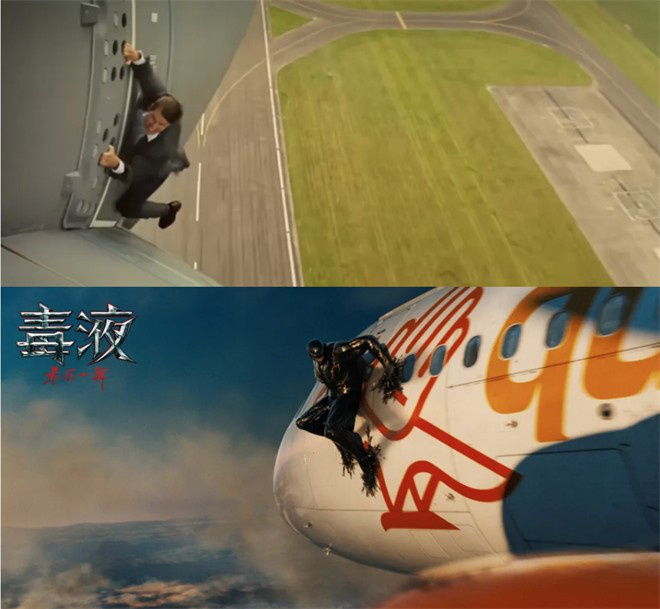 汤姆克鲁斯是怎么做到的?片中毒埃扒飞机时的台词让人会心一笑,显然在调侃《碟中谍5:神秘国度》里徒手扒飞机的阿汤哥。
