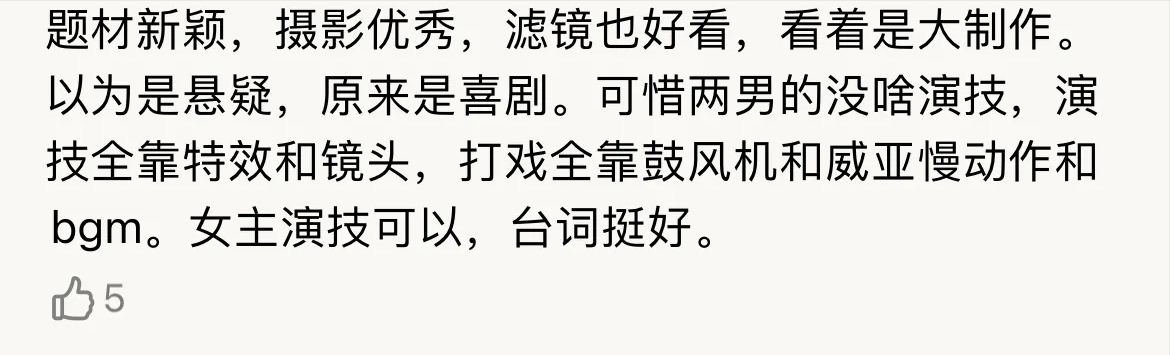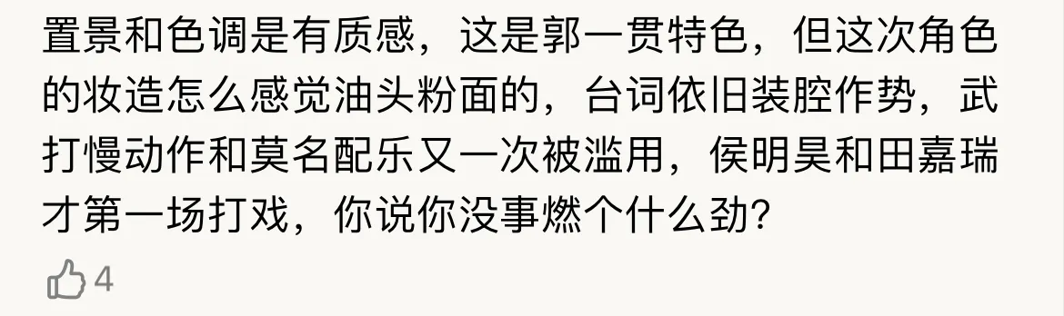 演员演技并不出彩,或者说非常一般,演技全靠特效与镜头,打戏全靠鼓风机与威亚慢动作和配乐,眼神戏非常的空洞。
