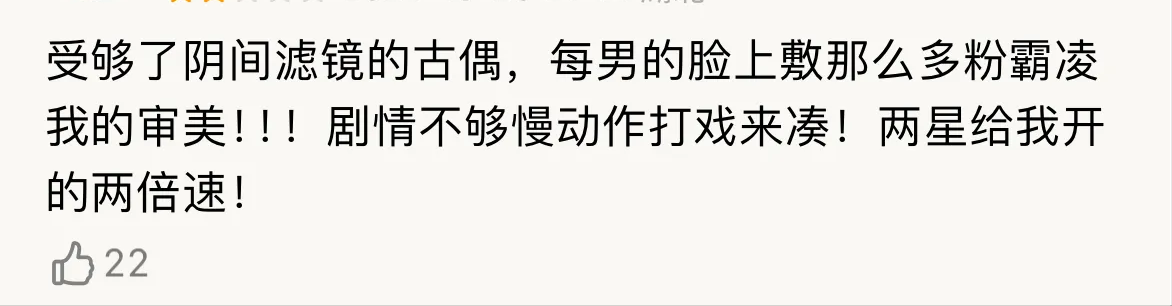 每个人说话的语速都很慢,个别演员说话过于阴柔,过于强调声音,显得有些装,或许是角色需要,但是观感真的不好。