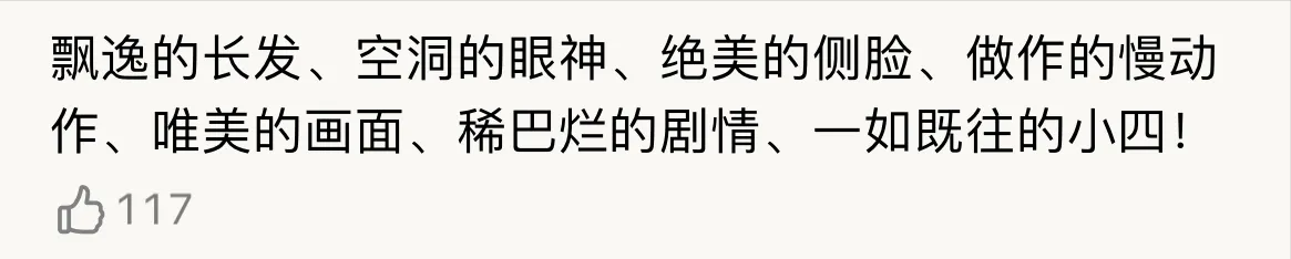 矫情做作,滤镜夸张,语速过慢,又是一部故弄玄虚的大型MV,或者说连这都算不上,因为并没有拍出演员的美。