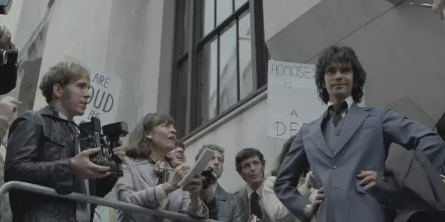 《英国式丑闻》的开场是索普和贝塞尔对时任首相哈罗德·麦克米伦的一番言辞挞伐,聊着聊着八卦起了自己的性向,还用「8比2」和「gay」的玩笑进行了一番自黑,末尾则是现实中的诺曼·斯考特,抱着爱犬注视镜头,屏幕下方一本正经地打出「他依然没有拿到社保卡」的黄色字幕。
