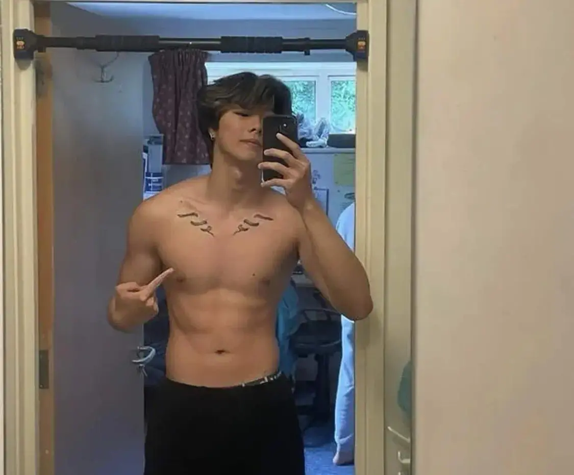 照片中可以看到,卢俊希继承了父母优良的基因,长相颇为帅气。虽说今年只有18岁,但腹肌已经特别明显了。