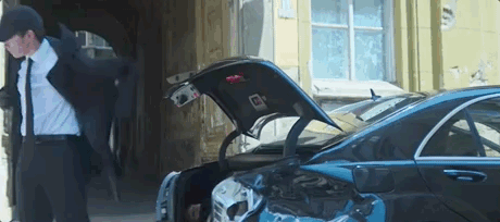 他在停车场劫了一个司机,随后伪装成司机的身份进入车队,接上目标后,果断杀掉一旁的保镖,从车队中飙车离开。