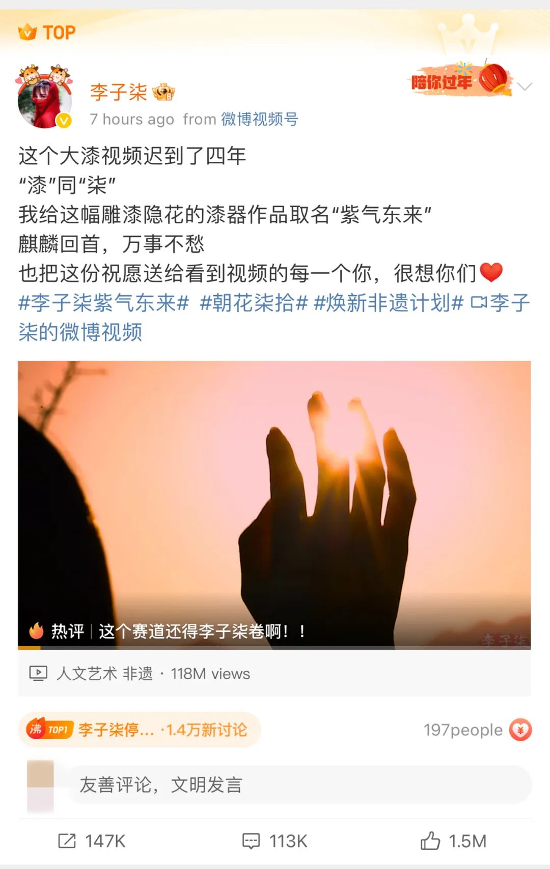 第一部新作名为《雕漆隐花,雕出紫气东来!》,李子柒在视频介绍时表示,“这个大漆的视频迟到了四年,‘漆’同‘柒’,我给这件作品取名‘紫气东来’,寓意吉祥如意。”