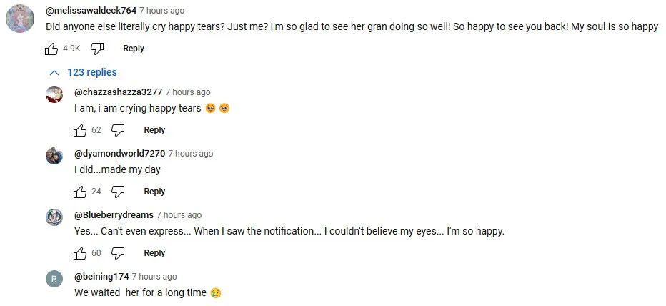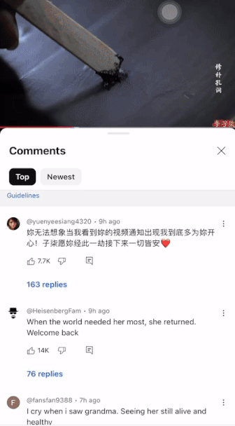 看到你回来就像做梦一样,因为我几乎每天都在播放你所有的旧视频。你的视频真的帮助我应对焦虑,每当我觉得世界运转得太快而跟不上时,你的视频就会安慰我。你给了我很多帮助,让我活得精彩,我无法形容看到你回来我有多开心和高兴。谢谢李子柒❤❤❤❤祝你未来万事如意