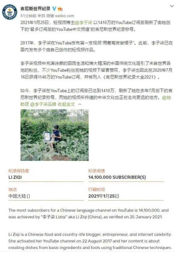 2021年1月25日,她还创下了最多订阅量的youtube中文频道的吉尼斯世界纪录。