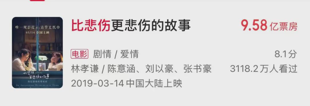 抛开以上提到的“诈骗”、为原著“朝圣”等原因外,悲剧爱情片本身就有一定的市场。