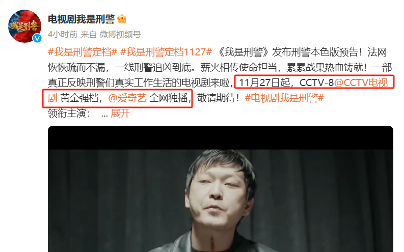 《我是刑警》将于11月27日在CCTV8黄金档开播,并在桃厂同步网播。