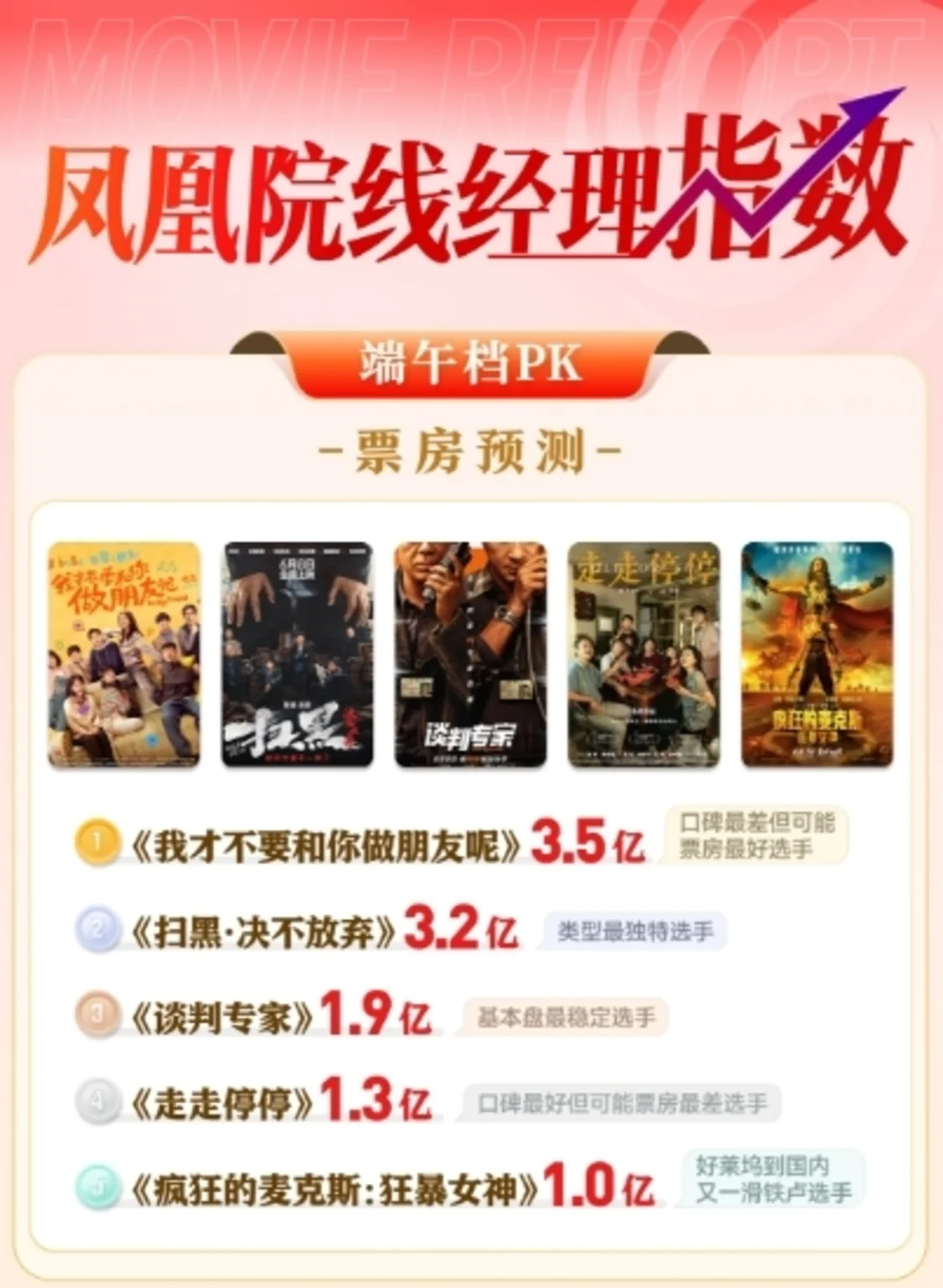 凤凰院线经理指数汇集全国多位一线电影院线工作者,从5个维度评估及预测电影市场走势,包括:卡司实力、导演实力、制作精良程度、宣发效果、综合评分。以院线专业人士的视角,配合直观的多维图,为行业提供真实、新鲜、有价值的参考数据,力争成为电影院线走势的风向标,也为观众选择线下观影提供借鉴及参考。