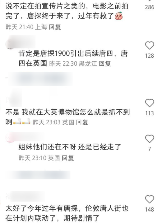 有不少网友表示,现在拍摄《唐探4》,如果赶上春节档的话可能会太赶了,从而担心不够时间剪辑。其实,《唐探4》已经在今年10月份就杀青了,已经完成配音工作了。所以很多网友猜测表示,王宝强和刘昊然这一次在英国拍戏,可能是在捕拍某些情节,或者是拍摄一些宣传物料。