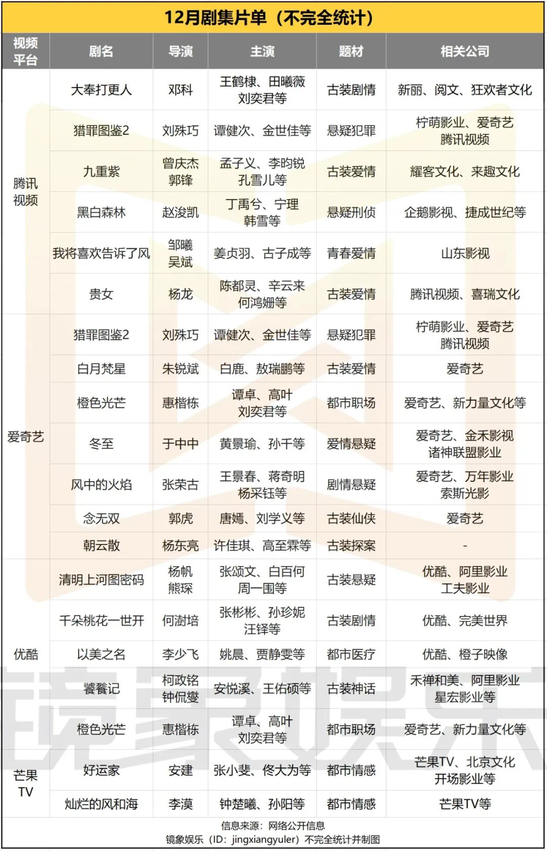 近日,原班人马回归的《猎罪图鉴2》开播后颇受关注,在此之前,腾讯视频、爱奇艺更是早早发布了12月的待播剧片单,《大奉打更人》《白月梵星》《冬至》等剧引得不少人期待。