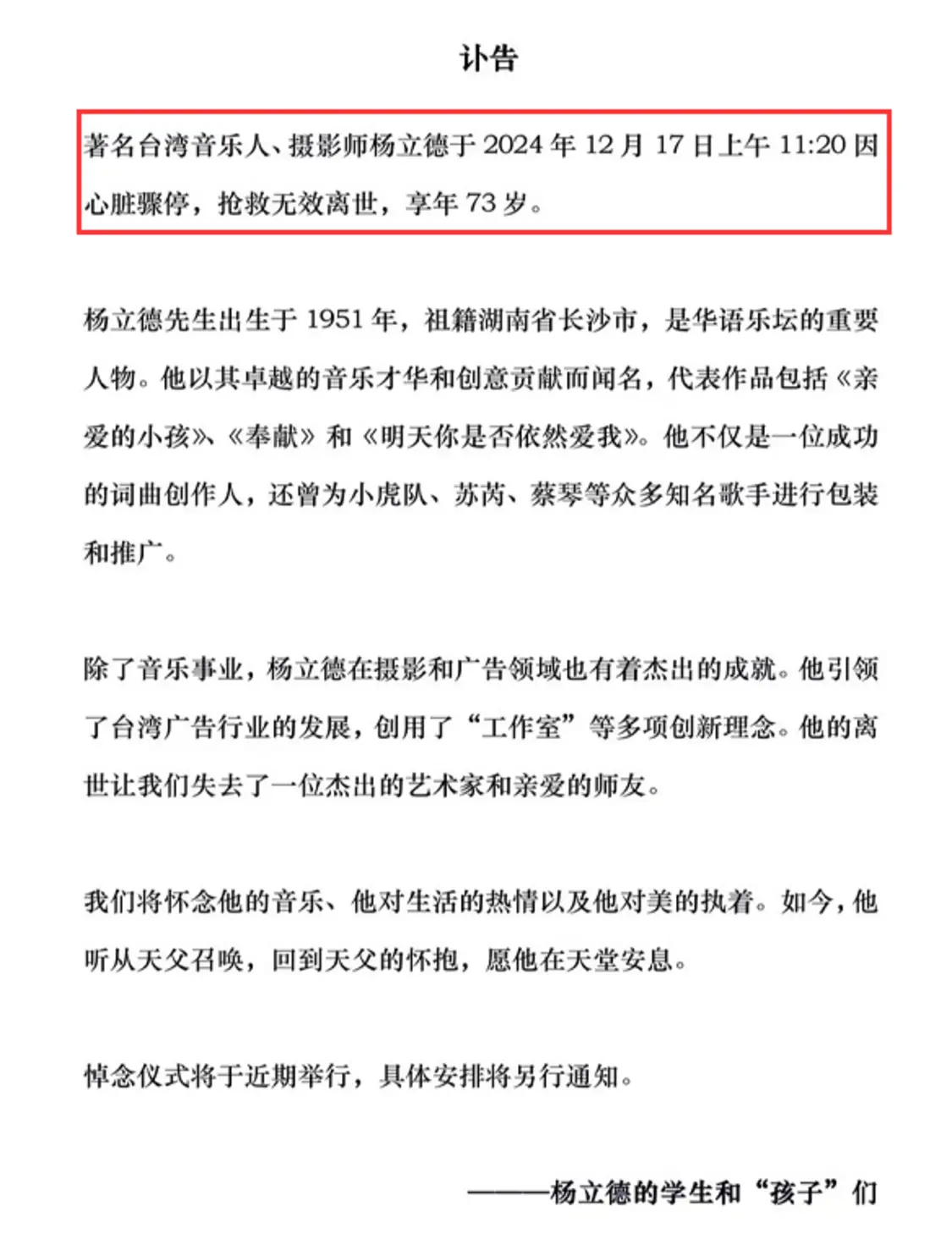 杨立德的悼念仪式会在近期举办,只是具体日子暂未对外公布,而关于他离世的详细情形也还没有更多消息传出。