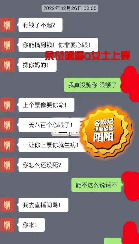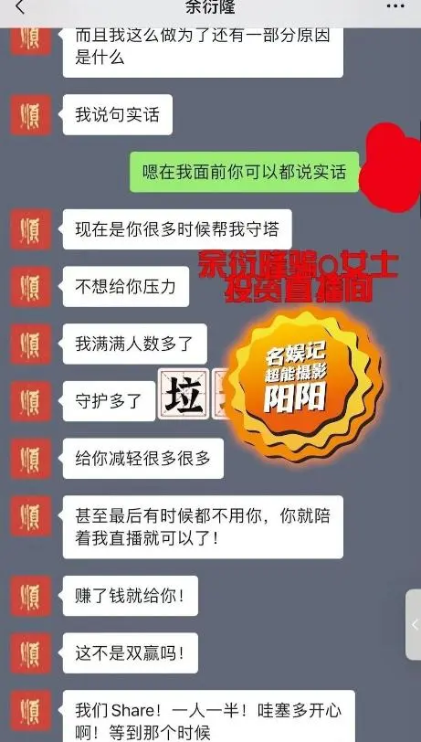 Q女士是阿娇的粉丝,在直播间点余衍隆唱TWINS的歌,打赏了200块钱。后来余衍隆主动加了Q女士,摸清她的家底后,提出来让Q投资,把自己的直播间做大。