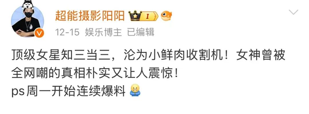 12月15日,狗仔“超能摄影阳阳”爆料:顶级女星知三当三,沦为小鲜肉收割机!女神曾被全网嘲的真相朴实又让人震惊。