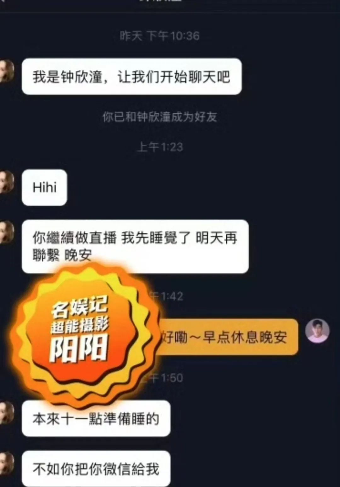 直播打赏成为榜一大姐之后,钟欣潼主动私信余衍隆,索要微信。