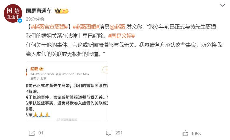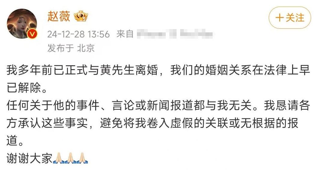 赵薇亲自发了微博,称两人多年前已正式离婚,法律上也解除了婚姻关系了的,还称关于黄有龙的事件都与她无关,也不希望卷入这些报道中。