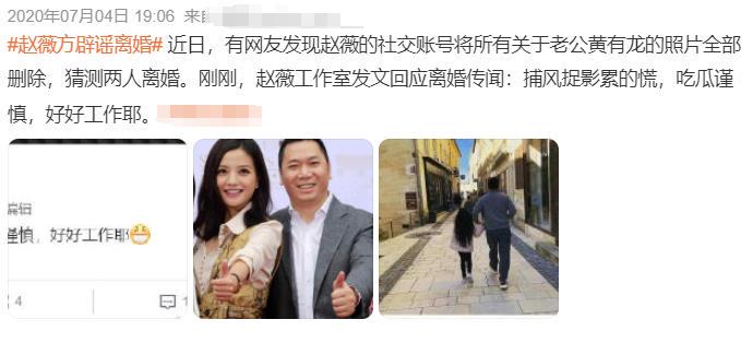 关于俩人离婚这事儿其实在2020年就有传过了,当时赵薇被网友发现社交账号已经删除了和黄有龙的照片,但工作室立马澄清了。