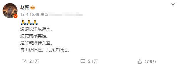 12月4日琼瑶离世,赵薇发文悼念琼瑶,也为琼瑶送去了花篮。这次发博也是她被封杀后三年多来的首次发文。