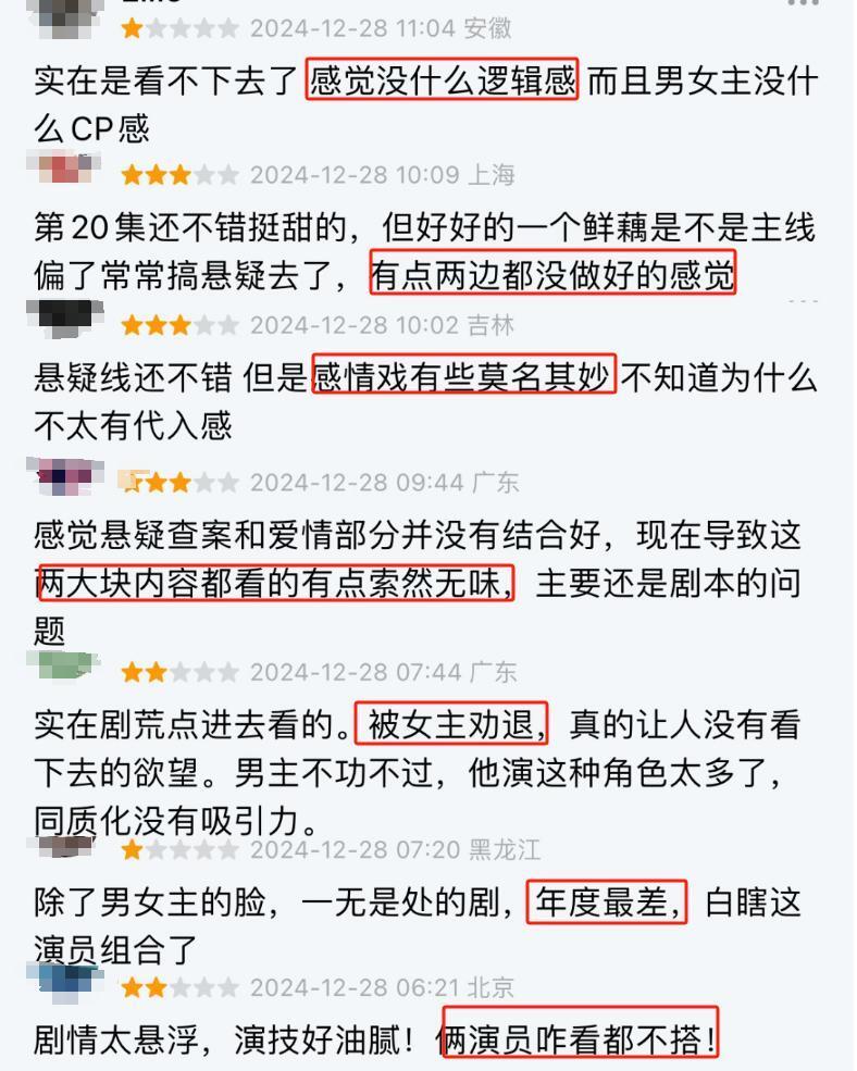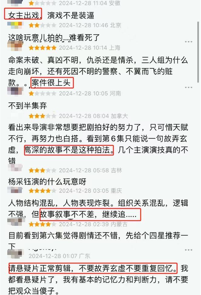 “女主出戏,演得太烂”、“剧情故弄玄虚,高深的故事不是这种拍法,白瞎几位主演的演技”、“案件很上头”。