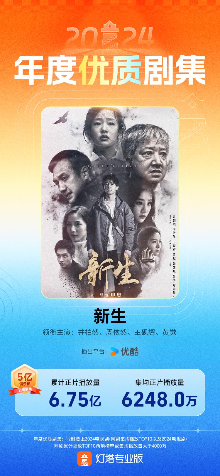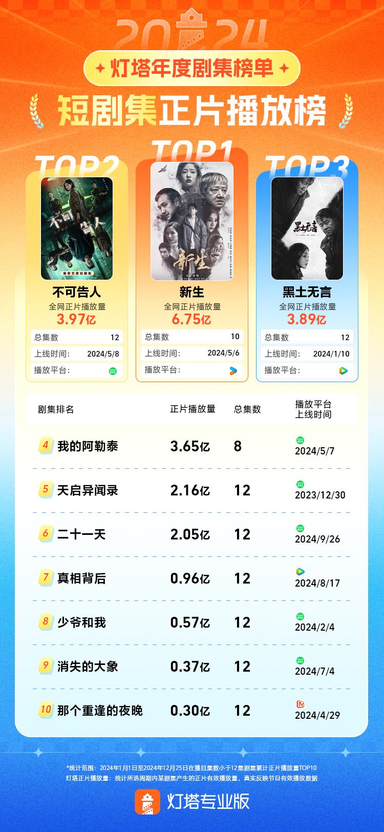 2024全网正片播放量·短剧集榜单TOP10 NO.1《新生》全网正片播放量6.75亿 NO.2《不可告人》全网正片播放量3.97亿 NO.3《黑土无言》全网正片播放量3.89亿