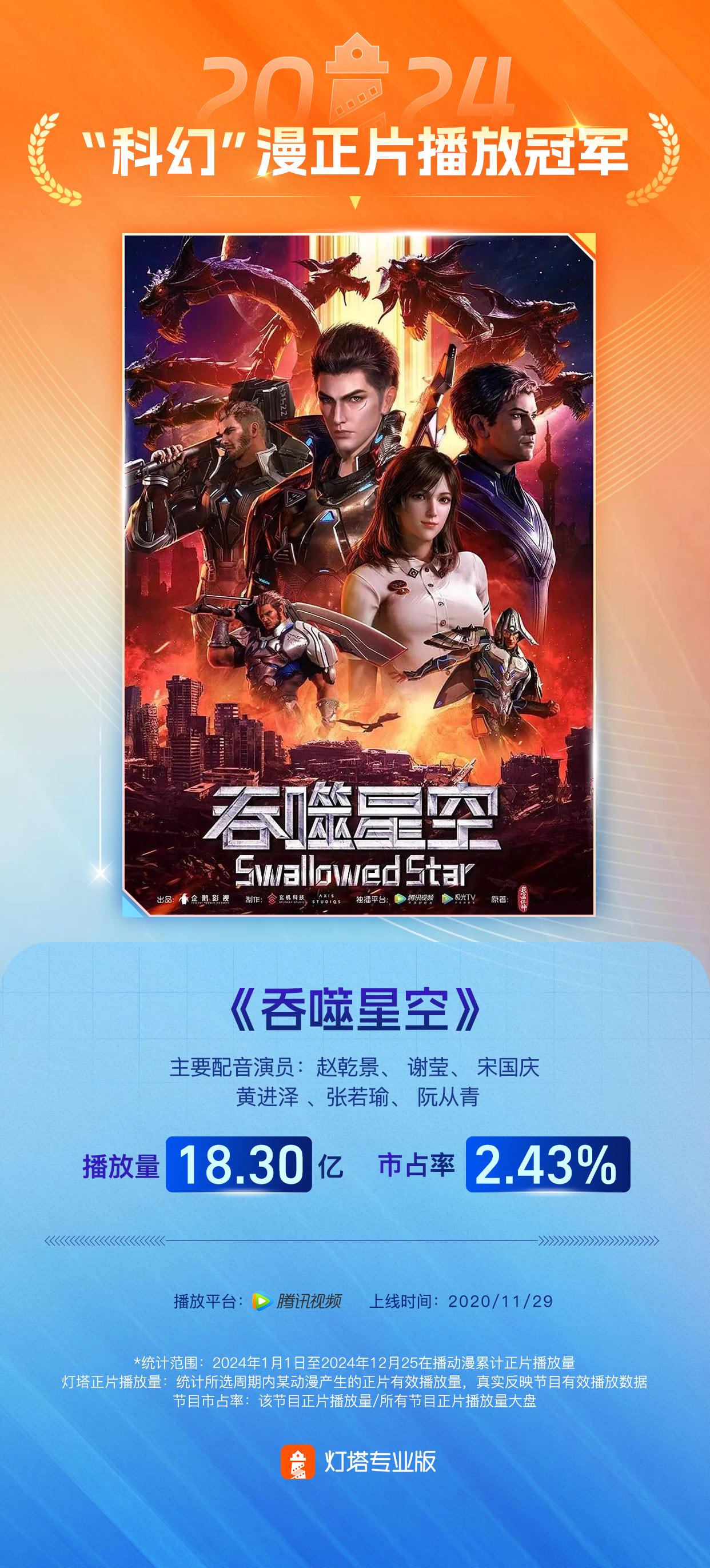 动漫剧集《吞噬星空》灯塔累计正片播放量达18.3亿,获得2024科幻漫正片播放冠军!