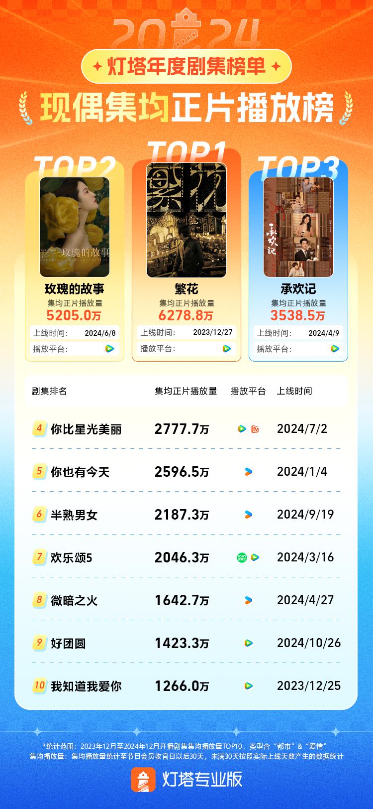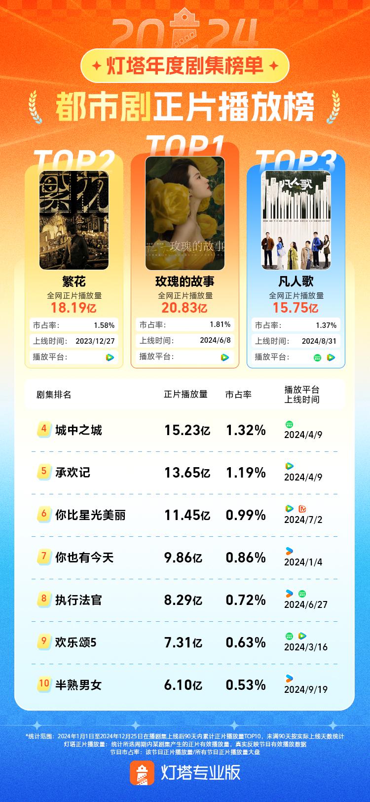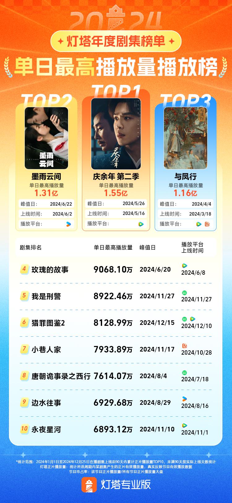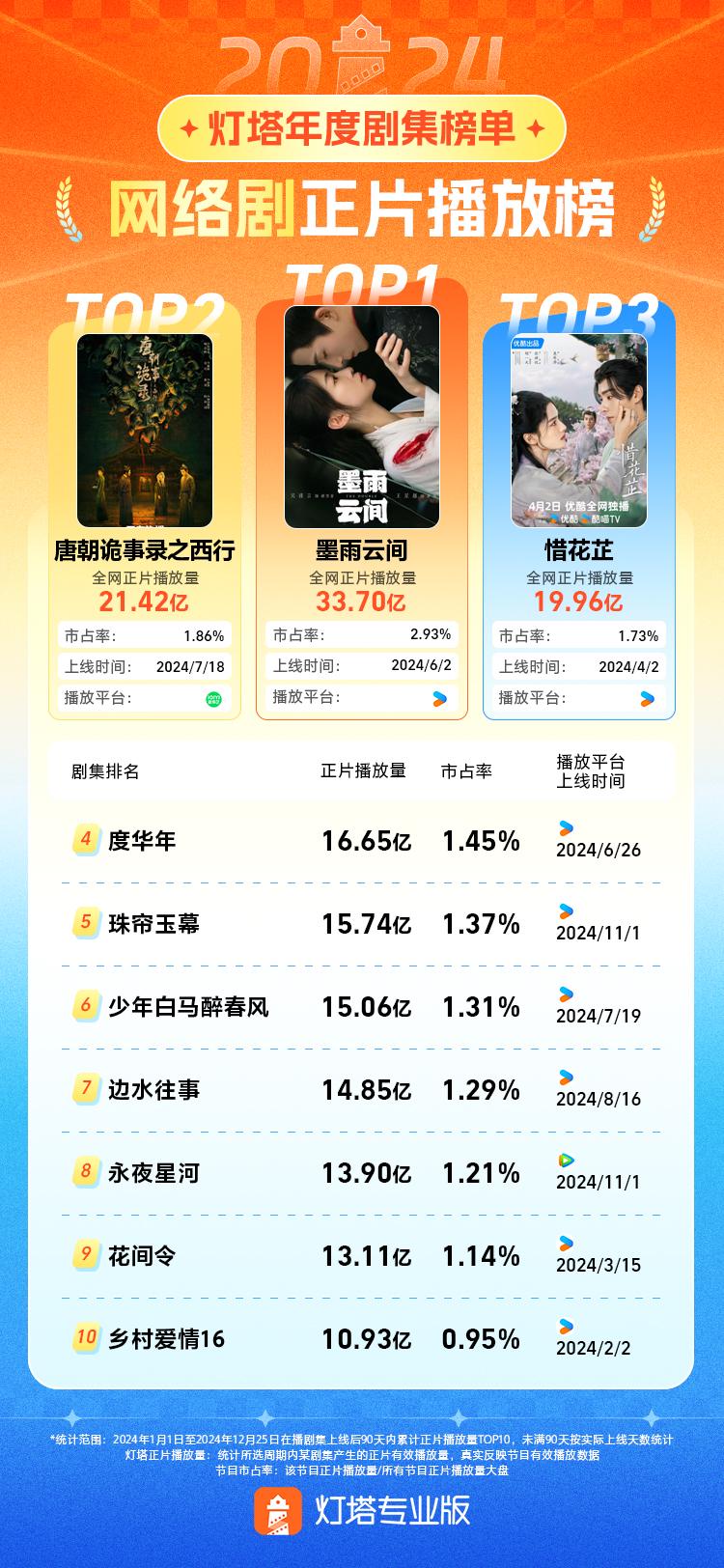 剧集正片播放排行 2024全网正片播放量·剧集总榜TOP10