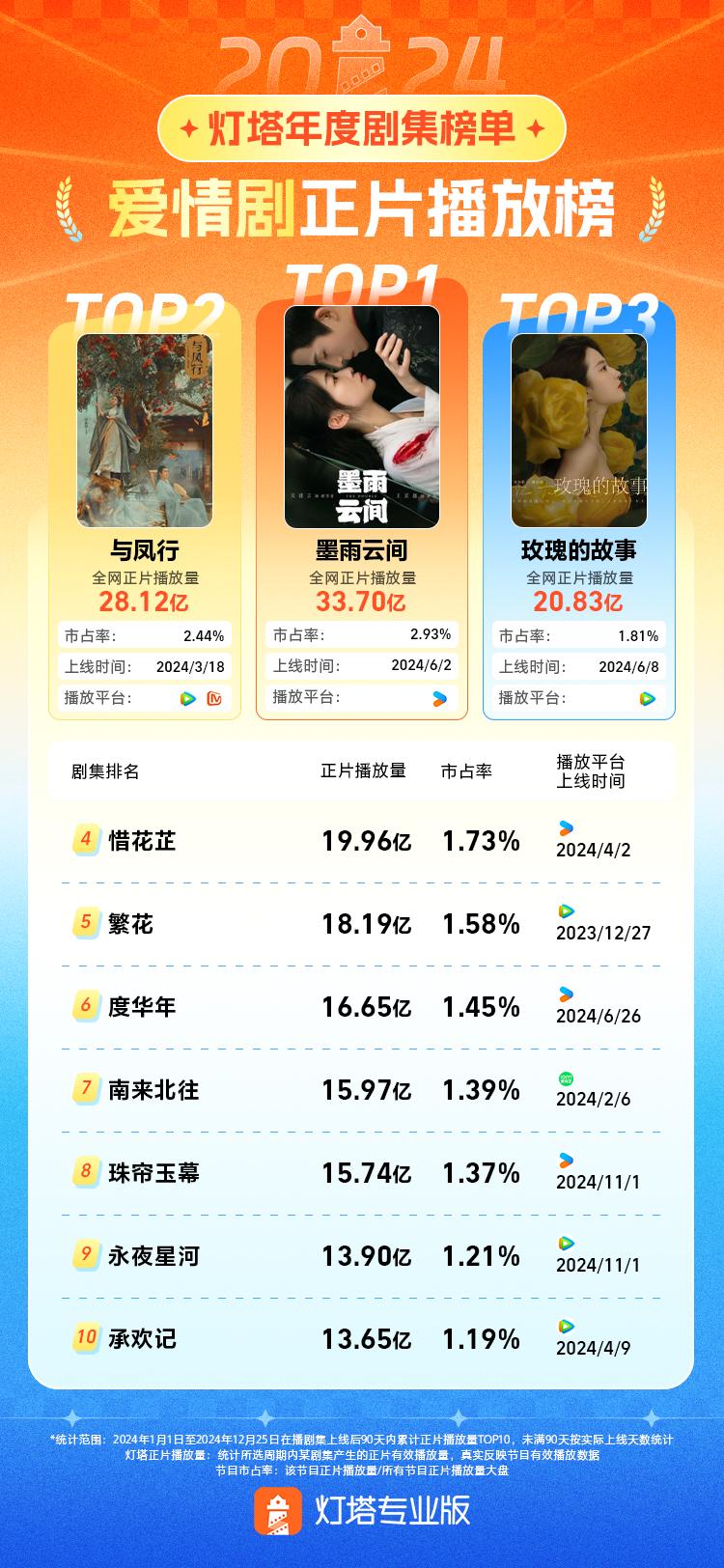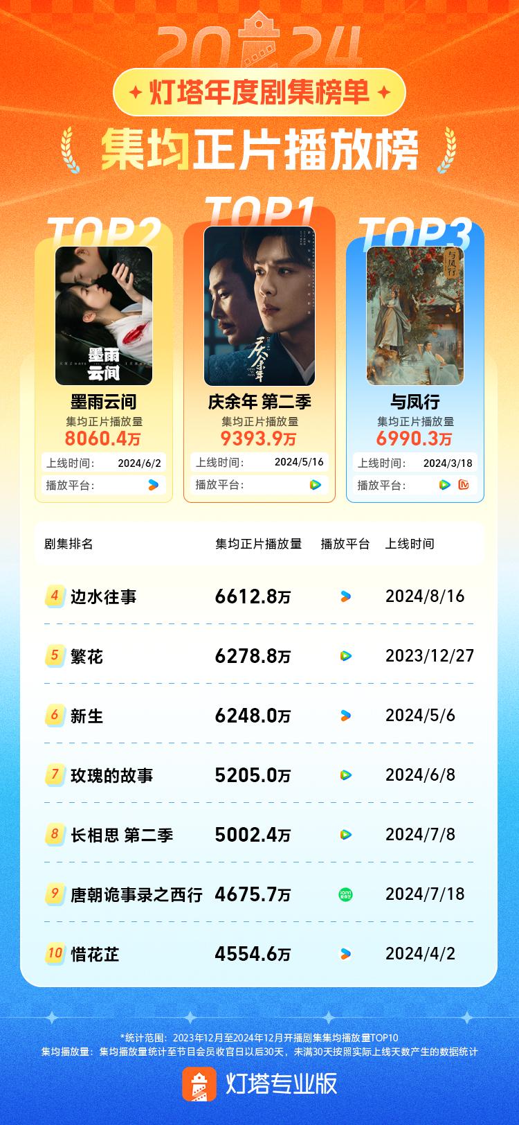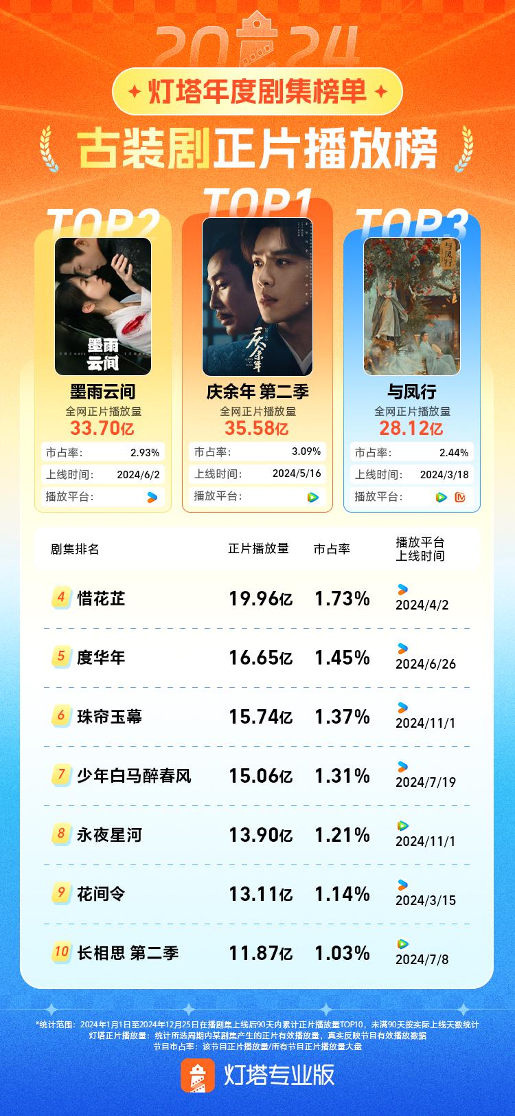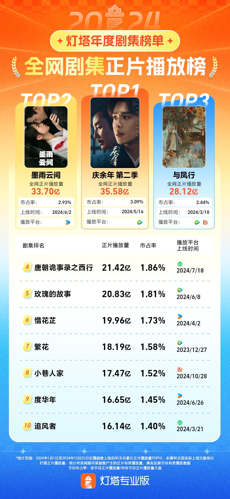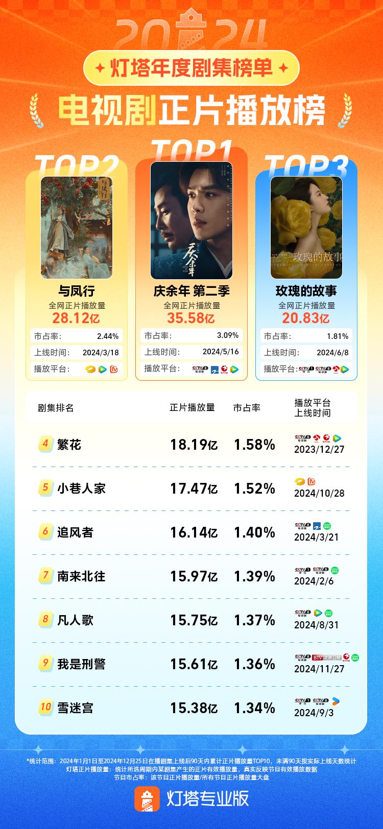 2024全网正片播放量·电视剧榜TOP10 NO.1《庆余年 第二季》全网正片播放量35.58亿 NO.2《与凤行》全网正片播放量28.12亿 NO.3《玫瑰的故事》全网正片播放量20.82亿