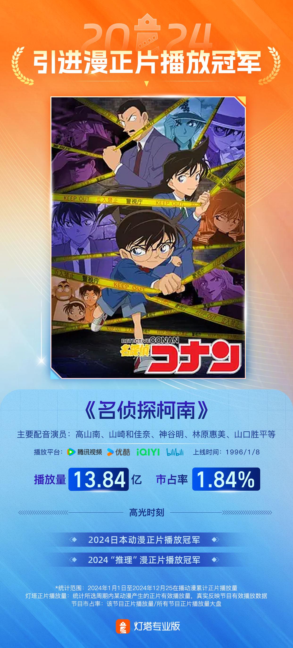 动漫剧集《名侦探柯南》灯塔累计正片播放量达13.84亿,获得2024引进动漫正片播放冠军、2024日漫正片播放冠军、2024推理漫播放冠军!28年后柯南还是这么能打!