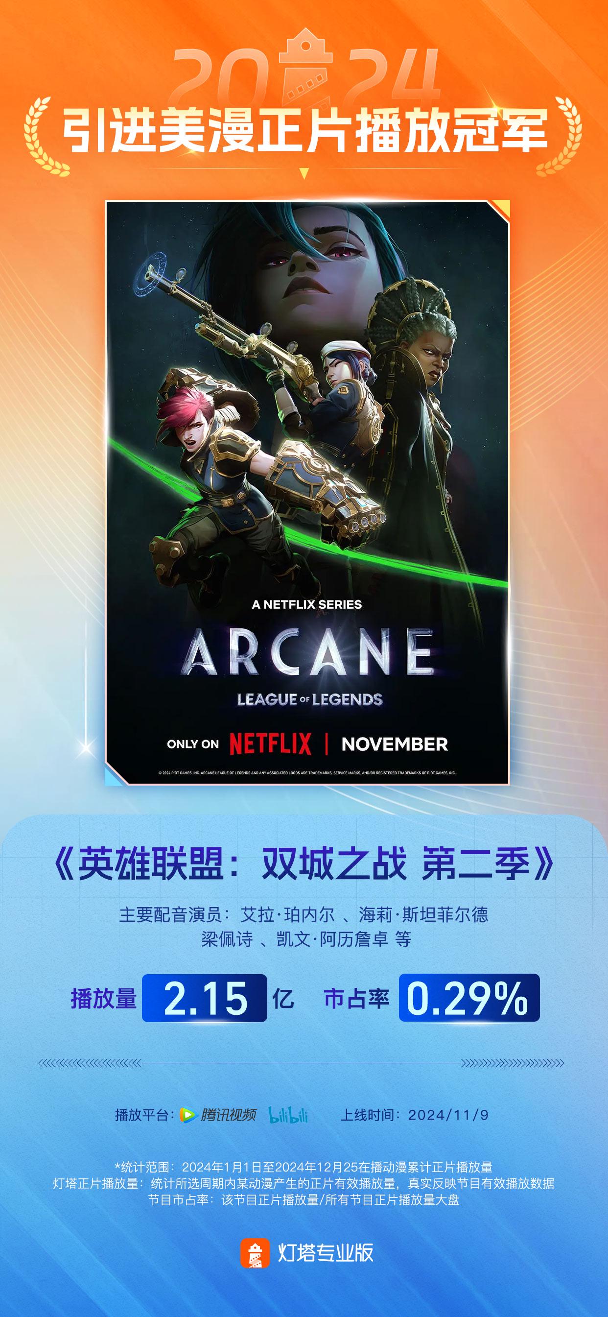 动漫剧集《英雄联盟:双城之战 第二季》灯塔累计正片播放量达2.15亿,获得2024引进美漫正片播放冠军!