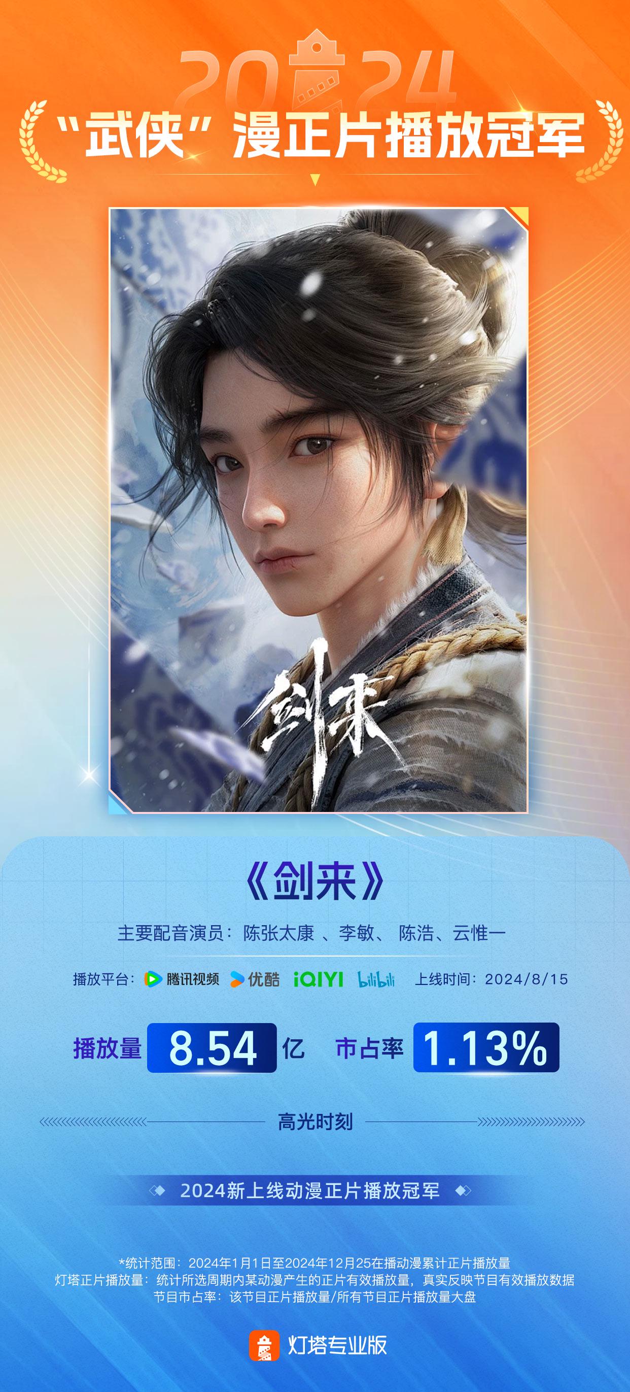 动漫剧集《剑来》灯塔累计正片播放量达8.54亿,获得2024武侠漫正片播放冠军、2024新上线动漫播放冠军!