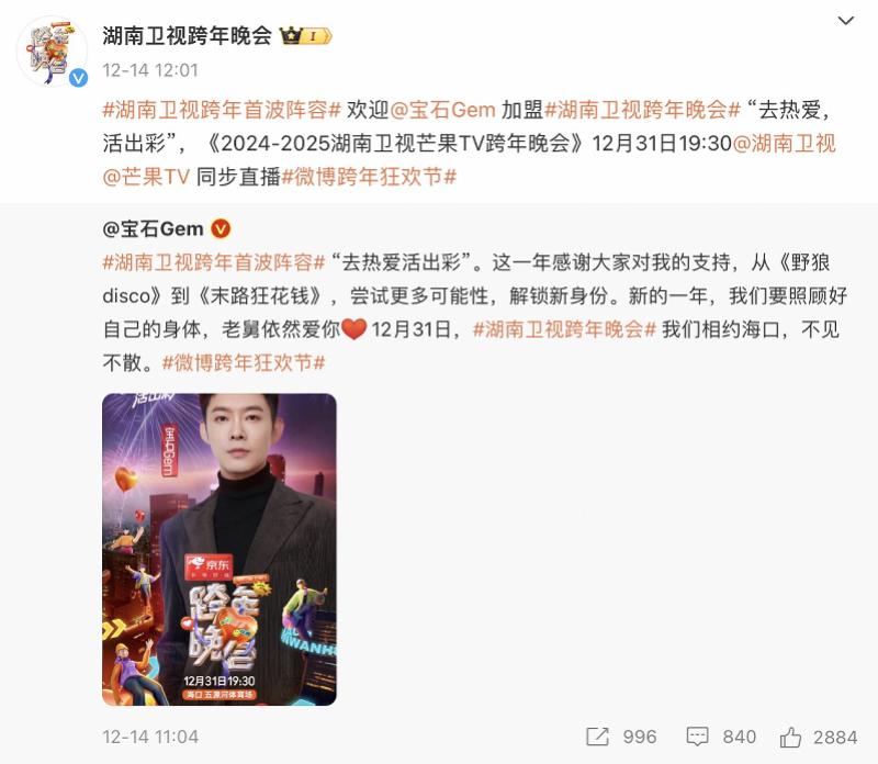 12月31日,湖南卫视跨年晚会官方微博发布《2024-2025湖南卫视芒果TV跨年晚会》节目单。节目单中删除了之前宣发的嘉宾宝石老舅。此前,宝石老舅在微博上预告,“ 12月31日,湖南卫视跨年晚会,我们相约海口,不见不散!”湖南卫视跨年晚会官方微博发布的“嘉宾全阵容”里也有宝石老舅。