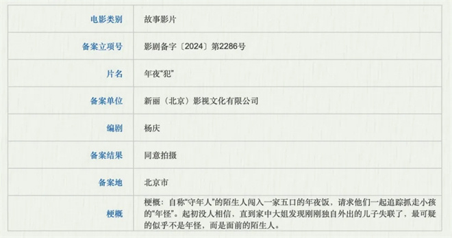 《年夜犯》作为杨庆时隔十年回归执导的电影,讲述了自称守年人的陌生人闯入一家五口的年夜饭,请求他们一起追走抓走小孩的年怪,从目前释出的故事简介和演员阵容,将会是一部略带荒诞的犯罪喜剧。