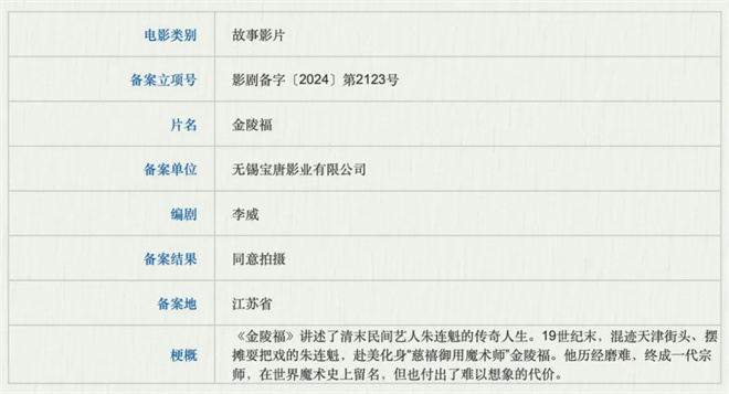 根据目前已知的消息,本片将会讲述清末的民间艺人朱连魁如何赴美化身慈禧御用魔术师金陵福,历经磨难,终成一代宗师的故事。