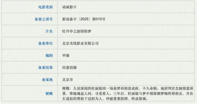 《牡丹亭之游园惊梦》的编剧请来了曾执导过《兔子暴力》的申瑜,影片讲述了杜丽娘与梦中情郎柳梦梅之间跨越阴阳的凄美爱情故事。